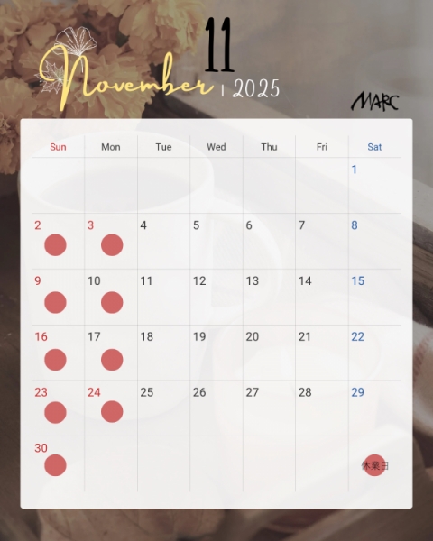 2025年11月の営業予定 2025-11-01 13:38:57 2025年11月の営業予定です。今月は特にイレギュラーも無く、通常通り日月曜日にお休みをいただきます。急に寒くなりましたので皆さんお身体に気を付けて、美味しいお酒を飲んでくださいね!