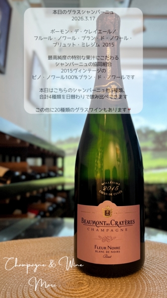 2026年3月17日(火) 本日のグラスシャンパーニュ 2026-03-17 11:57:37 本日のグラスシャンパーニュボーモン・デ・クレイエール/フルール・ノワール・ブラン・ド・ノワール・ブリュット・ミレジム 2015