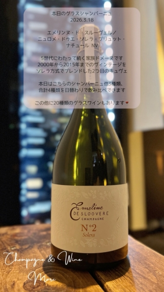 2026年3月18日(水) 本日のグラスシャンパーニュ 2026-03-18 14:45:16 本日のグラスシャンパーニュエメリンヌ・ド・スルーヴェル/ニュロメ・ドゥエ・ソレラ・ブリュット・ナチュール NV